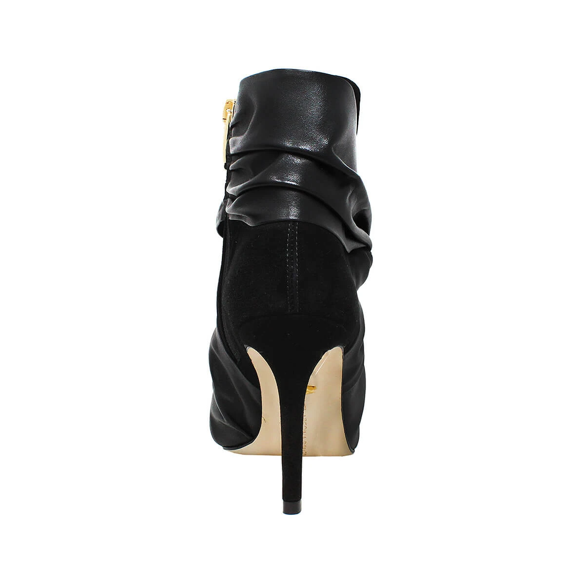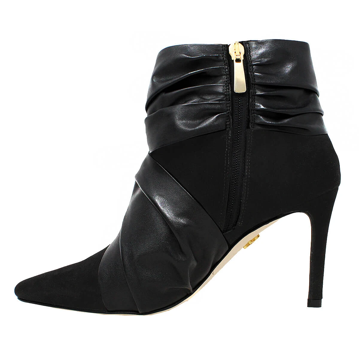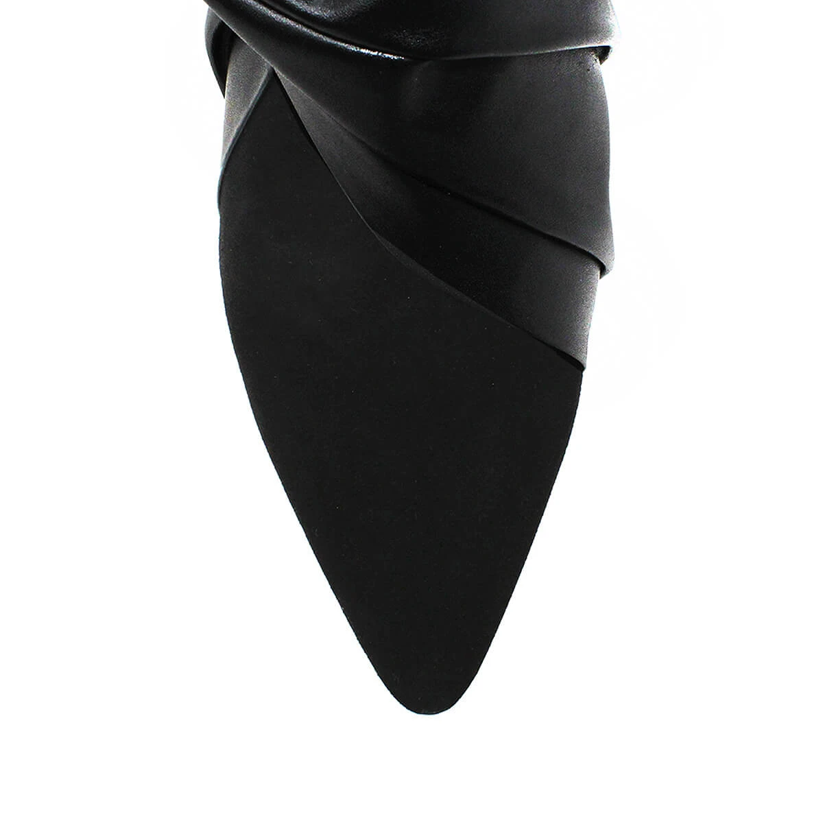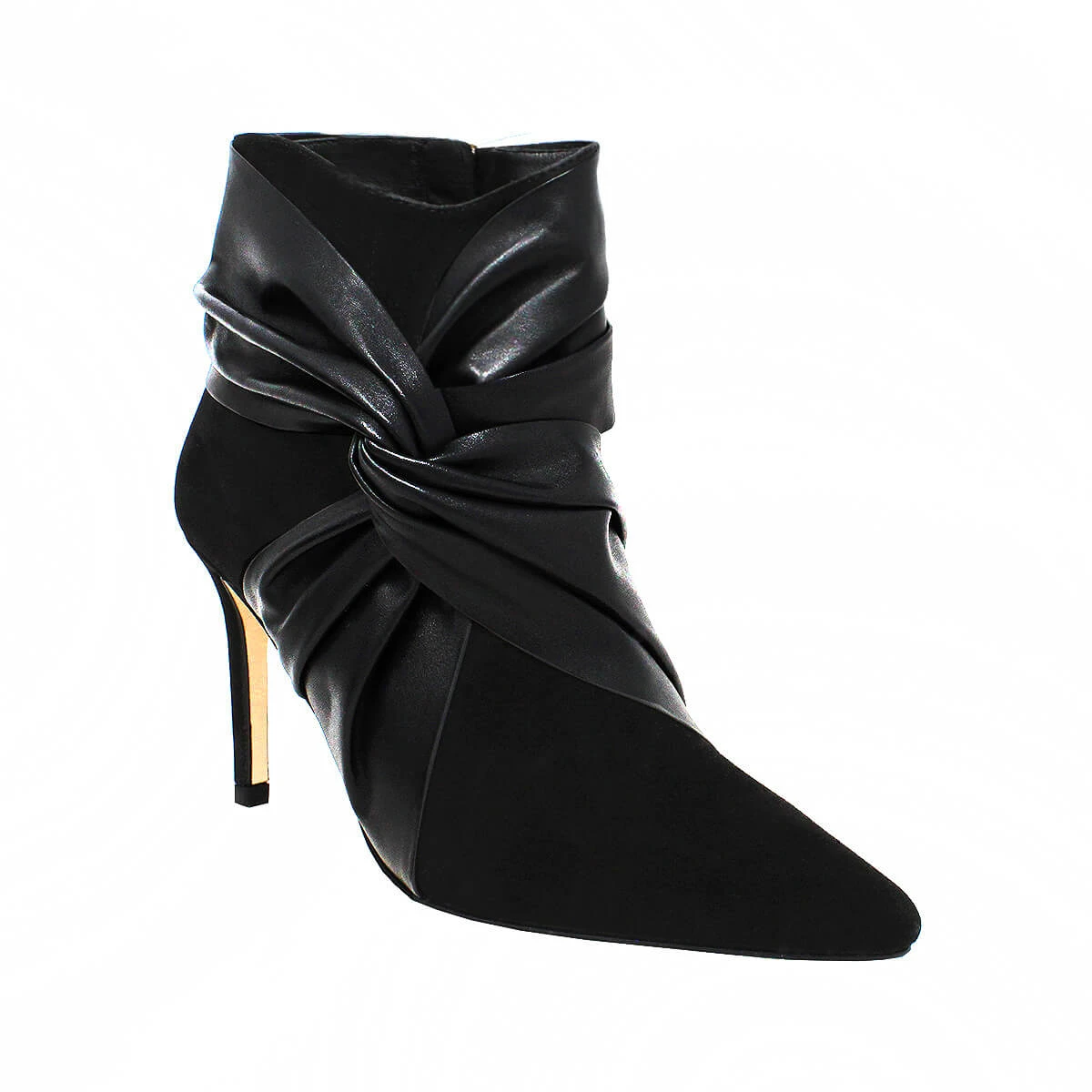 Un nudo drapeado en piel adorna el costado derecho de nuestra nueva botita de tacón alto, creada en ante. Volumen, profundidad y hechura, Beatrice es una obra de arte en los pies.