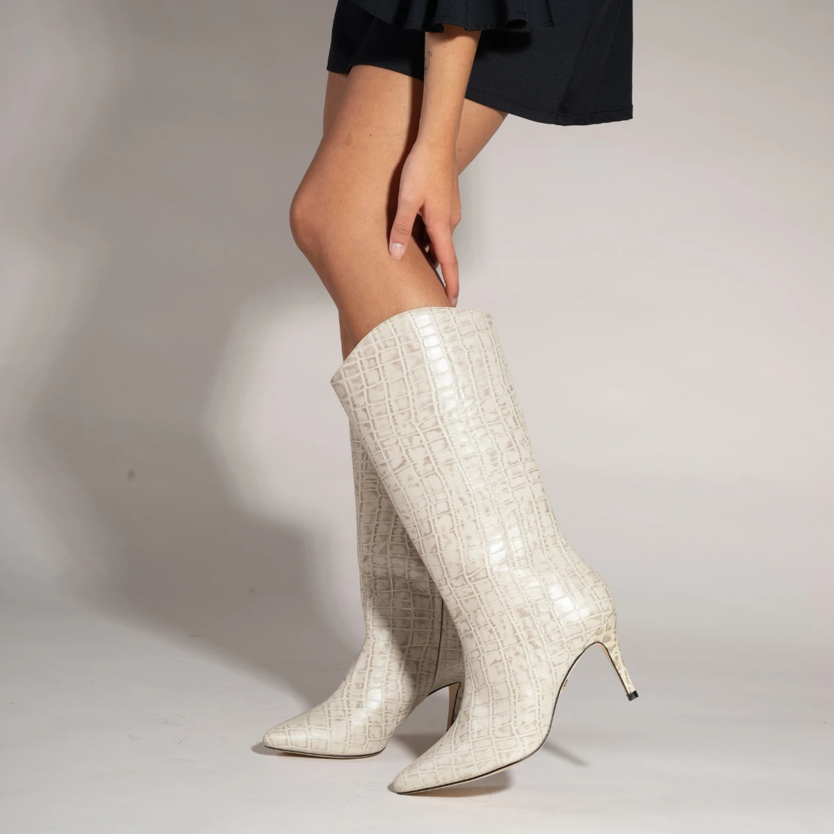 Paola es nuestra bota alta de tacón ultra cómodo, hecha con una textura alter-croco en piel que enfatiza la silueta simple y elegante, además de llevar un cierre oculto lo que le da practicidad sin perder la sofisticación. Una silueta ancha y ultra moderna que envuelve tus piernas y luce increíble.