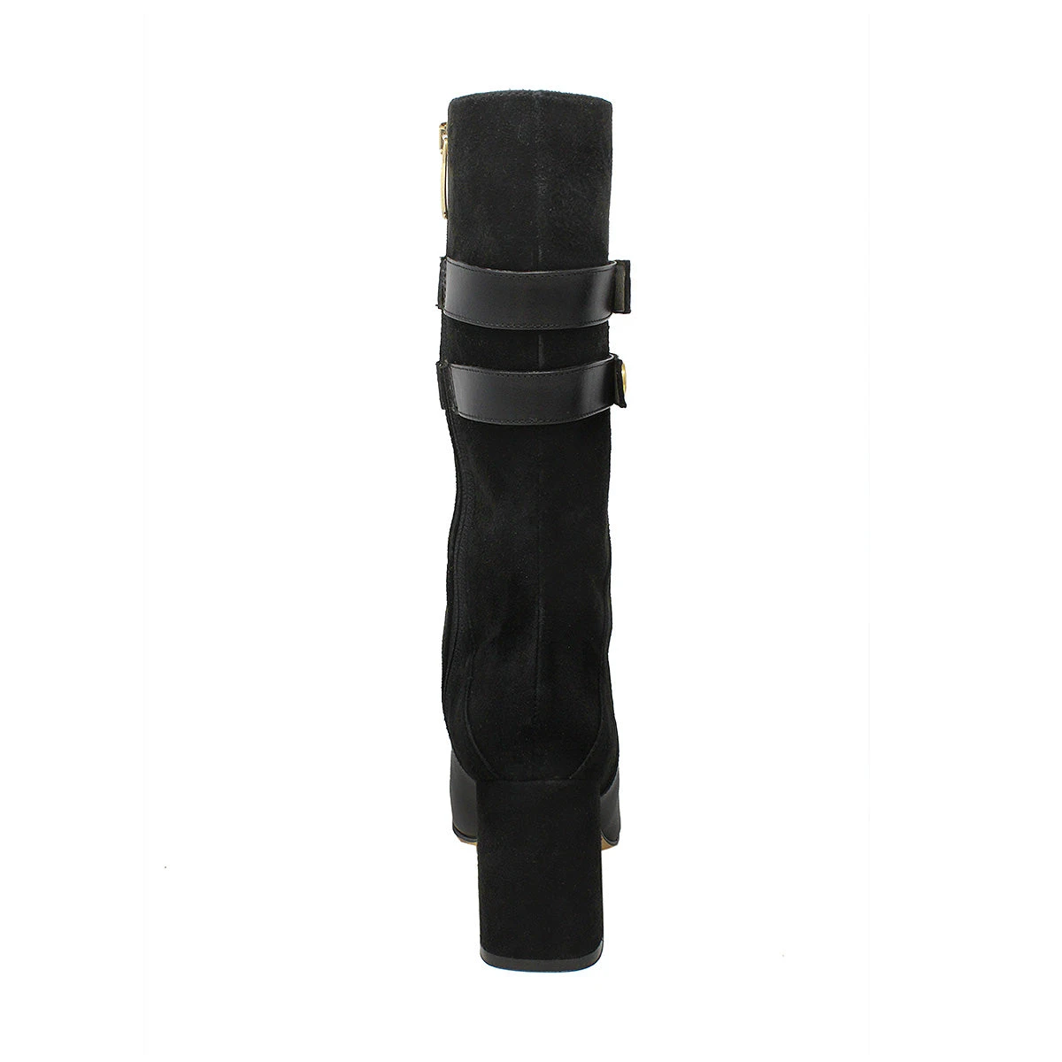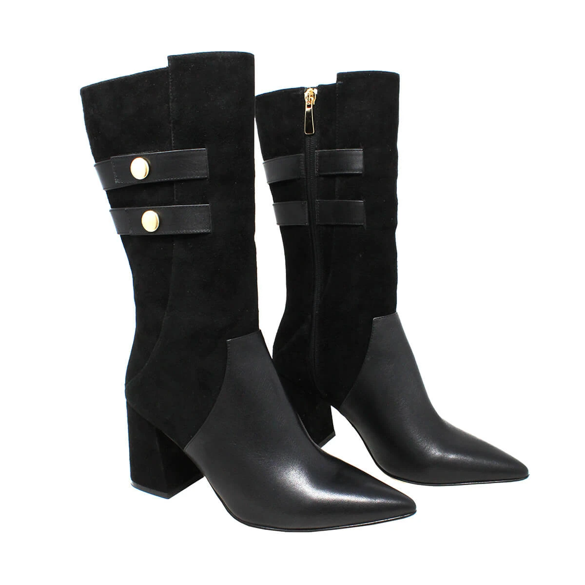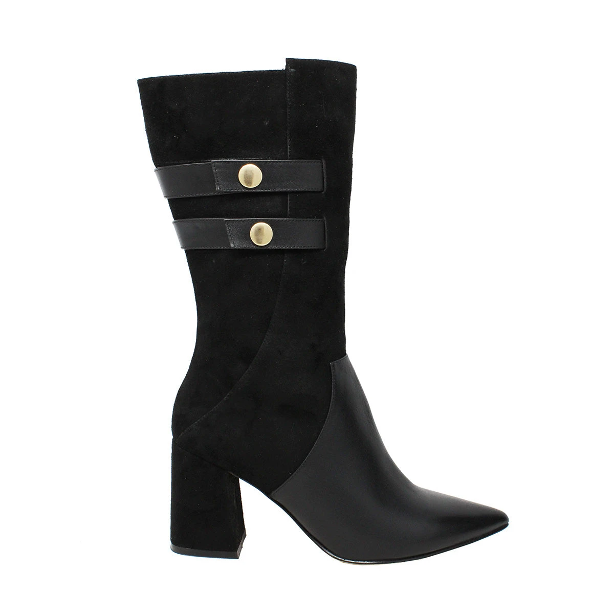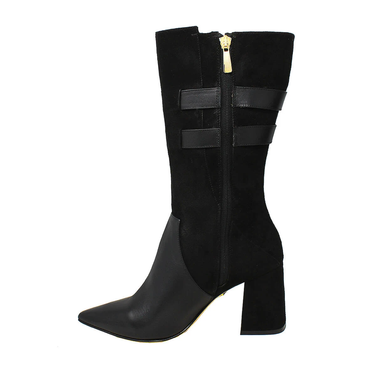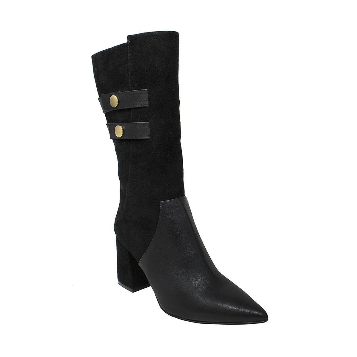 Nuestra nueva bota de media caña estiliza perfectamente la pierna hasta abajo de la rodilla, dos cintas sujetas con un broche de presión abrazan la bota para tener total ajuste y darle un toque de luz con su acabado en oro brillante. Su diseño viene con un contraste de ante y piel al tono, dandole volumen y estilo a nuestra nueva botita.
